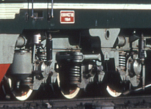 A close up of a DF4 bogie showing the link that transmits tractive forces between the bogie and the loco body. The primary suspension shows Alsthom influences.