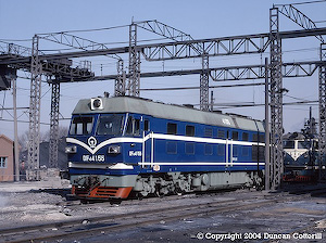 A minority of DF4C carry this extremely attractive livery of all over blue with white lining. Unusually the locos chosen seem to be spread throughout the number series. What this signifies is unknown. DF4 4155 was photographed at Changchun depot on 2 February 1996.